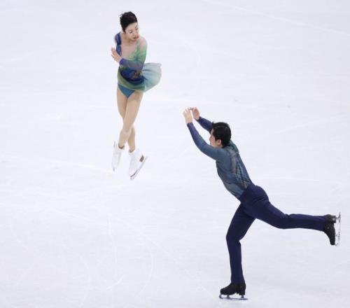 2月16日,中国选手隋文静(左)/韩聪在双人滑自由滑比赛中。新华社记者 陈益宸 摄
