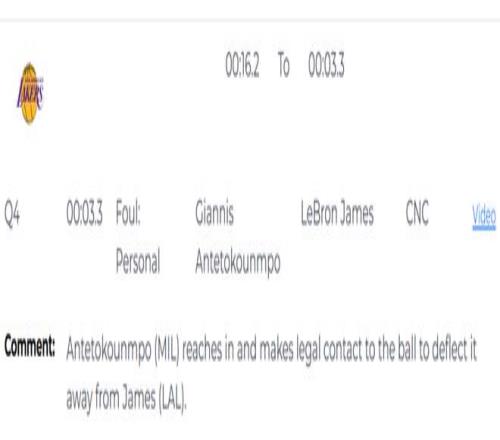 在昨天的NBA常规赛,湖人101-105不敌雄鹿,最后30秒,詹姆斯在一次突破中被字母哥盖帽。不过从照片上来看,旁边防守的特纳已经明显犯规。不过,已经出炉的NBA最后两分钟裁判报告对这一球解释为没有犯规。